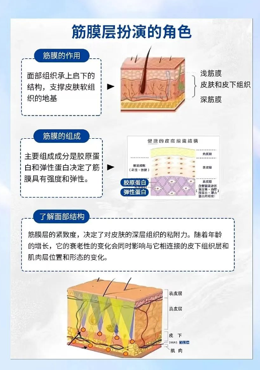 而筋膜层一旦老化松弛,意味着胶原纤维的弹力不足,这张网状的皮筋整体失去弹性,对肌肤深层组织的粘附力不足,就会导致皮肤呈现皱纹、松弛、下垂、肥垮、塌陷、变形等衰老状态。