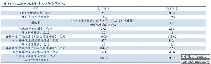 合计存量与增量市场空间,我国化工废水每年市场空间为1993.9亿元,城市污水空间为706.8亿元。化工废水处理的市场空间是城市污水的近3倍。