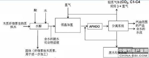 图1. 从木质纤维素生物质通过生物质水解产生的溶液进行水相加氢脱氧可生产汽油的方块流程图