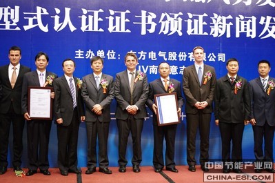 20111020,东方电气集团东方电机有限公司资子公司东方电气新能源设备(杭州)有限公司公司(以下简称“新能源公司”)生产的DF82-1500直驱永磁风力发电机组通过TUV 南德意志集团(以下简称TUV SUD按照 GL 导则进行的 A 级设计评估型式认证,颁证仪式在北京国际风能大会暨展览会期间举行。TUV 南德意志集团风能部经理 Martin Webhofer博士和 TUV SUD大中华集团副总裁Wolfgang Hübl先生在仪式中别向新能源公司技术开发部部长郑北超先生及新能源公司总经理詹明先生颁发了设计认证和型式认证证书。TUV SUD 大中华集团高级副总裁金灿先生、TUV SUD风能部总经理Ernst Donislreiter先生东方电气集团党组成员、副总经理朱元巢先生东方电气集团东方电机有限公司总经理贺建华先生东方电机有限公司总经理新能源公司董事长兰向军先生等出席并且见证了本次仪式。
