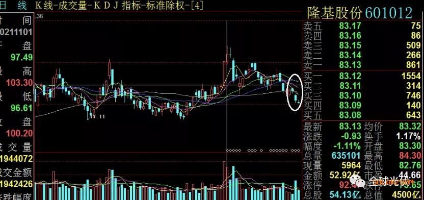 隆基官宣硅片降价当日起,股价已连续三天大幅下跌,跌破前期箱体整理线,今日收盘价仅83.13元,一个月前即11月1日,隆基股价才创新高103.30元。