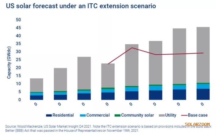 Wood Mackenzie公司在其发布第四季度光伏市场洞察报告中包括一个预测场景,用于评估“重建更好”法案对光伏行业的影响(名称为“ITC扩展情景”)。该法案于2021年11月19日在美国众议院通过。如果在美国国会获得通过,这项立法将为光伏行业带来更加显著的好处。在未来五年内,预计将增加部署43.5 GW的光伏系统,比在基本情况下的预期增长31%。