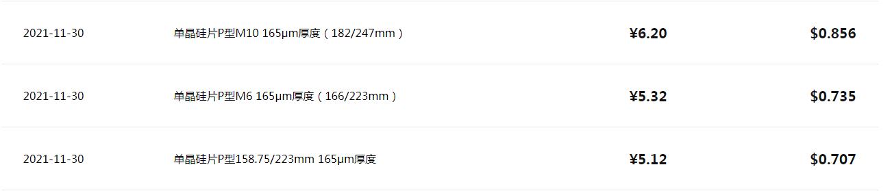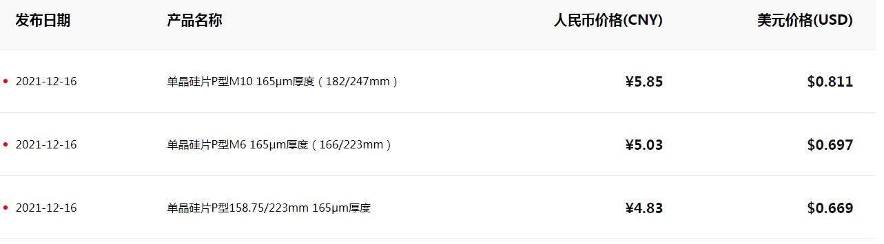 16日,隆基官网报价显示,单晶硅片P型M10 165μm厚度(182/247mm)价格下调至5.85元,单晶硅片P型M6 165μm厚度(166/223mm)下调至5.03元,单晶硅片P型158.75/223mm 165μm厚度下调至4.83元。