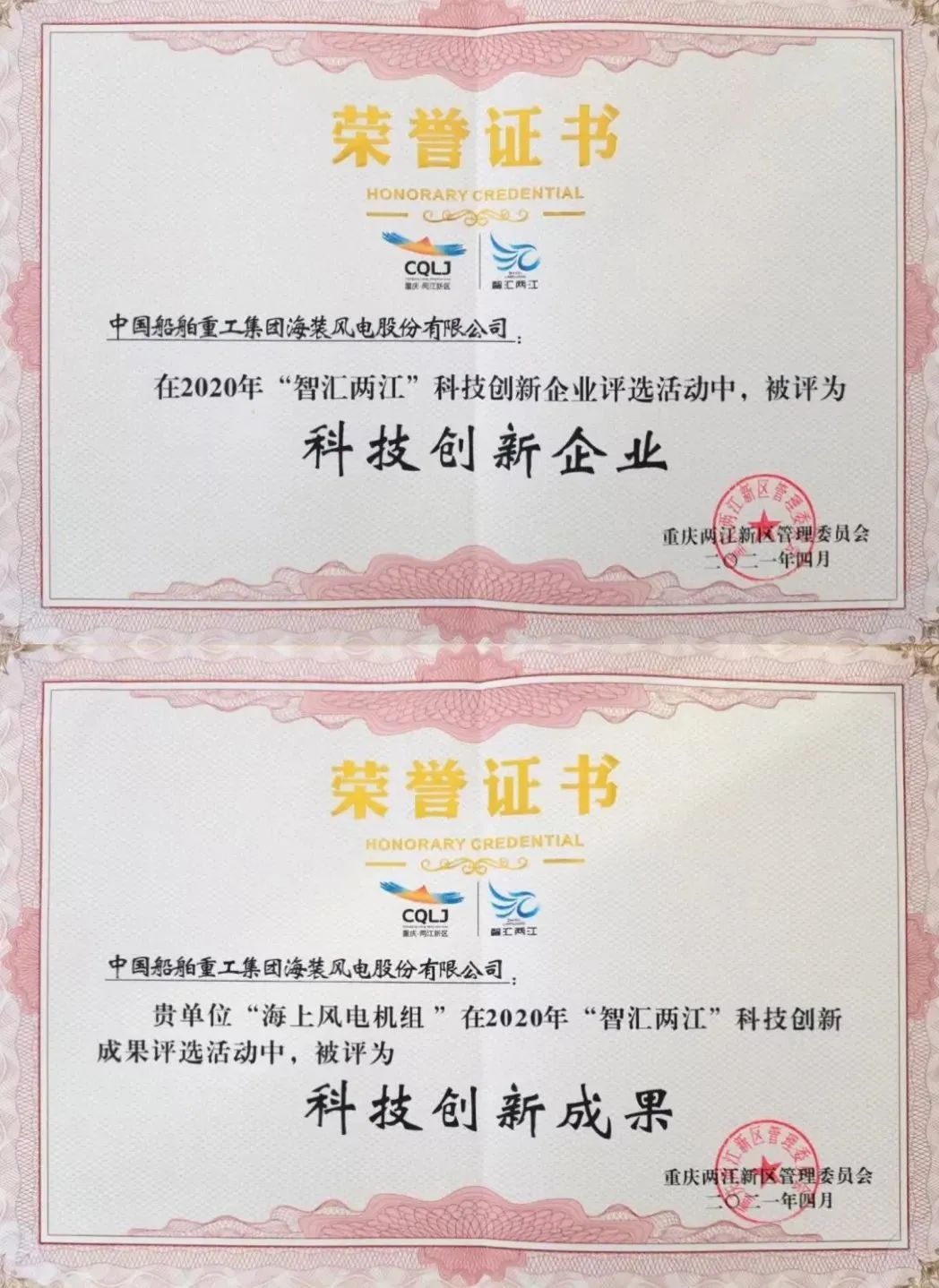 4月20日,重庆两江新区召开智汇两江·2020科技创新年度发布会。中国海装获“智汇两江·2020科技创新企业”;中国海装海上风电机组被评为“智汇两江·2020科技创新成果”。
