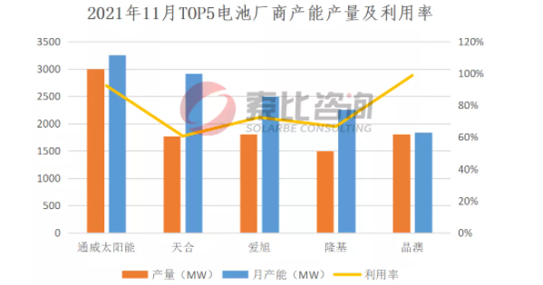 2021年11月,电池企业产量比上月有很大回升,总产量为17.79GW,环比增加10.98%。按照产量排名,通威、天合、爱旭、隆基、晶澳位列前五,企业总产量9.89GW,占比55.59%,综合利用率78.16%。垂直一体化企业综合利用率率82.56%,主流电池企业综合利用率69.43%。预计12月电池企业开工率有所缓解,价格持稳。