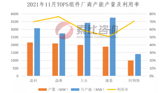 2021年11月,终端需求上升,因此本月组件产量比上月大幅回升。国内组件产量15.65GW,环比增长14.48%。按照产量排名,晶科、晶澳、天合、隆基、阿特斯位列前五,企业总产量9.15GW,占比58.47%,综合开工率65.18%。预计12月下游组件价格大幅下调,组件需求将逐步回暖。