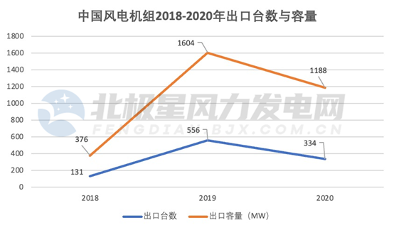 中国风电机组出口起于2007年,首次由华仪风能向智利出口了3台780kW的风电机组,此后十多年间,我国风电陆续保持不高的出口数量,到2011年开始突破百兆瓦。2018年至2020年,我国出口风机台数分别为131台、556台、334台,对应的容量分别为376MW、1604.6MW、1188MW。