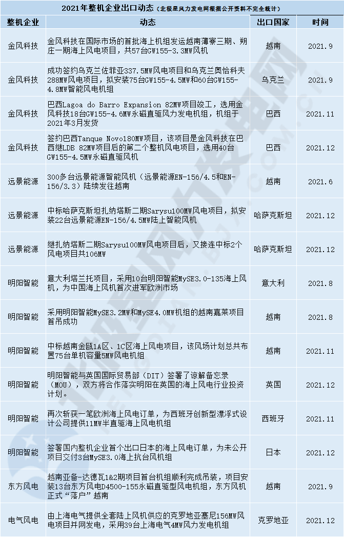 2021年国内风电整机商海外市场动态