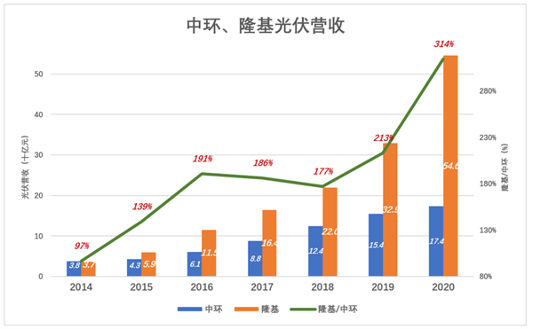 2018年,隆基营收相当于中环光伏业务收入的213%,2020年这个比例扩大到314%。