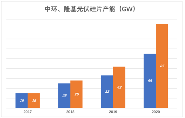 2017年,中环、隆基光伏硅片产能均在15GW一线。