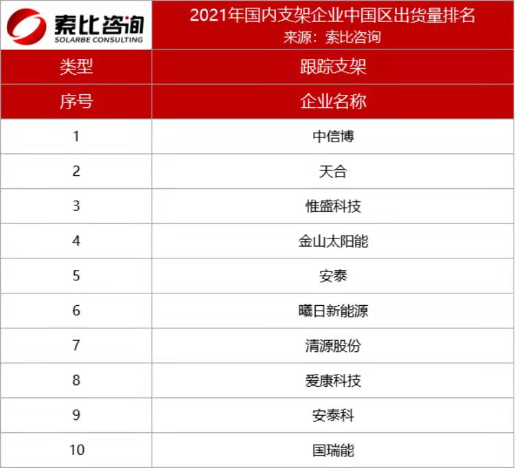 据索比咨询调查,2021年国内企业跟踪支架中国区出货量排名中,中信博、天合位列第一梯队,出货量占比TOP10总量的67%,这两家企业均在全球范围内有着的丰富的跟踪支架安装经验。