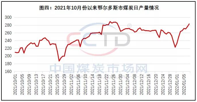 第四,煤炭保供政策措施继续显效。截止到目前,2021年开启的煤炭保供措施没有任何退出迹象,鉴于当年新增煤炭产能巨大(全国日均煤炭产量已经可以达到1200万吨以上,理论上2022年全年的原煤产量可以达到43.8亿吨),煤炭产能过剩倾向对国内动力煤市场的影响不容忽视,受产地煤炭需求旺盛、煤价高位运行的刺激,近期核心地区煤炭产量有望保持较高水平,例如鄂尔多斯市的日度煤炭产量在元旦过后迅速增加至高位(见图四)。