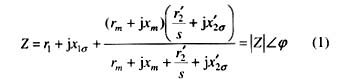 三相异步电动机可用T型电路进行等效,如图2所示,电机的功率因数角Φ为相电压与相电流的相位差,它等于电机一相阻抗Z的阻抗角。当电机参数已知时,阻抗Z可根据图2由式(1)计算: