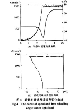 在电机端口加正弦电压时,根据理论分析,可得图3所示的转速与功率因数角关系曲线。由于晶闸管调压电路的工作原理所限,电机在软起动过程中获得的输入电压是一种斩波形式的电压,电机的功率因数角难以用实验的方法直接获得,即使得到基波的功率因数角,其实际应用价值也不大。根据晶闸管调压电路的工作原理,真正影响晶闸管输出电压的因素是电机的续流作用,而电机续流角的变化规律决定于其功率因数角,且该续流角便于实际测量,可称之为“可测功率因数角”。图4、图5分别为实际电机在轻载和重载条件下,在软起动过程中形成的电机转速及电机续流角的变化曲线,所选电机为:额定功率3kW,额定转速1440r/min。观察两组实测曲线可以看到,随着电机转速的上升,电机的续流角逐渐减小,当转速达到额定值时,续流角接近最小值,由于实际电机的转速由额定值向同步转速提升的余量很小,再加上测量原因,在续流角的回升阶段,电机转速的变化体现得不明显。对比两种情况下续流角的变化曲线可以发现,电机轻载稳定运行时的续流角较大,重载时较小。这是由于两种情况下的电机转速、激磁电流以及漏阻抗的不同造成的。实际电机续流角随转速的变化规律与图3所示曲线的规律是一致的,本文下面提到功率因数角时,均指续流角。