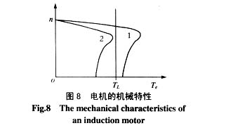 例如,对于恒转矩类负载,根据电机的机械特性,电磁转矩曲线与负载转矩曲线必须相交于线性段,电机才能稳定运行。在电机起动过程中,电磁转矩应始终大于负载转矩,电机的转速才能不断提升,为了限制起动电流,提供给电机的初始输入电压很小,随着电机转速的上升,应及时地提高电机输入电压,才能保持足够大的电磁转矩,这就要求对晶闸管触发角的调整要及时。假设晶闸管的触发角原来为α1,它对应的电机输入电压为u1,电机的机械特性如图8中曲线1所示。电机在此电磁转矩的作用下不断加速,根据图3、图6、图7的曲线可知,功率因数角Φ(或续流角)在不断减小,由式(3)可知晶闸管导通角θ也在减小,这将使电机输入电压由u1减小为u2,电机的机械特性由图8中的曲线1切换到曲线2,可以看到,此时的电磁转矩小于负载转矩,这将导致电机转速的下降,甚至有停转的可能;由于转速的下降,功率因数角Φ又会回升增大,引起晶闸管导通角θ也增大,电机的输入电压由u2增大为u1,电机的机械特性也由曲线2切换回曲线1,电机在此条件下重新加速。若晶闸管的触发角α1未得到及时调整,上述过程就会重复出现,即产生了电磁转矩振荡,从而引起电流振荡。