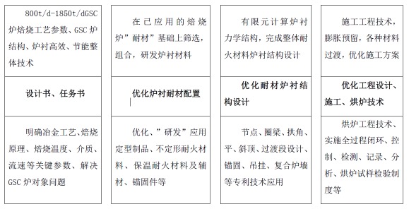 GSC炉衬从原料选用到制造全部国产化。以热能工程学理论优化和改造焙烧炉耐火炉衬材料及结构设置,优化和完善现有施工技术、烘炉技术、初投运技术。