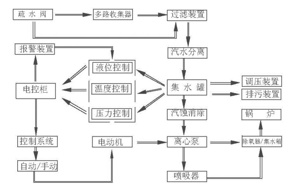 将蒸汽放热后形成的凝结水收集至集水罐进行汽水分离后,采用由PLC控制的离心泵以全密闭方式自动加压输送至规定位置,对其余热余压进行回收再利用。产品由多路共网器、集水罐、离心泵、自控柜、PLC控制器及通用阀门等构成。