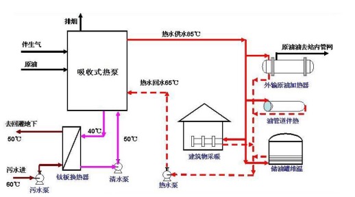 利用油田伴生气或者原油作为驱动热源,采用直燃式热泵技术,回收污水中的热量制取中温热水,用于外输原油加热器和油管道伴热,或者采油区的生活供暖。