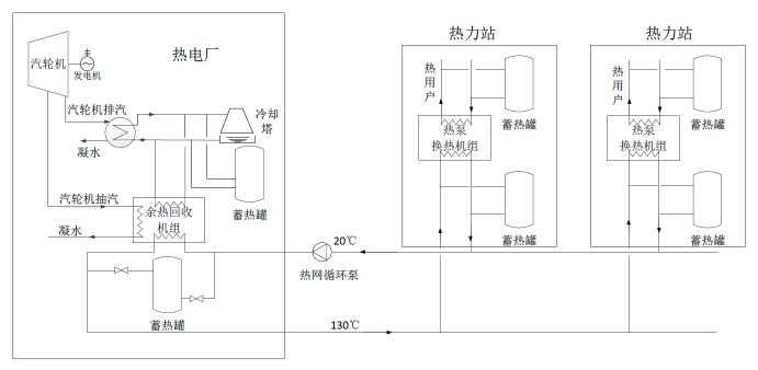 热电协同的集中供热技术针对常规采暖供热换热环节存在的不可逆损失,通过设置于用户热力站的热泵型换热机组和设置于热电厂供热首站的余热回收机组高效回收热电厂凝气余热供热;通过设置于热力站及热电厂的蓄热装置,实现用电负荷的”移峰填谷”,并扩大热电厂发电上网功率的调节范围。